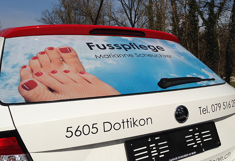 Auf die Heckscheibe wird eine fein gelochte Spezialfolie geklebt. Diese Klebefolie kann beliebig mit Bildern und Texten bedruckt werden. Die Werbefläche lässt sich beliebig gestalten. Dank der feinen Lochung in der Folie ist die Durchsicht und somit die Sicht nach Aussen gegeben. Von Aussen ergibt sich ein Sichtschutz ins Fahrzeuginnere und die Werbebotschaft sticht heraus. Die Heckscheiben-Werbung wirkt unaufdringlich und erfreut sich daher besonders grosser Beliebtheit. Eine sympathische Werbemassnahme.